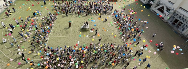 記念集会の最後は運動場に移動し、全校児童によるバルーンリリースを行いました。PTAの保護者の協力で短時間で一気に風船を配布し、子供たちのカウントダウンで一斉にリリースしました。風船は南東方向に風に乗って飛んでいき、子供たちは風船が小さく見えなくなるまで声をあげながら見守っていました。きっと子供たちにとってもいつまでも記憶に残る良い思い出になったことと思います。
